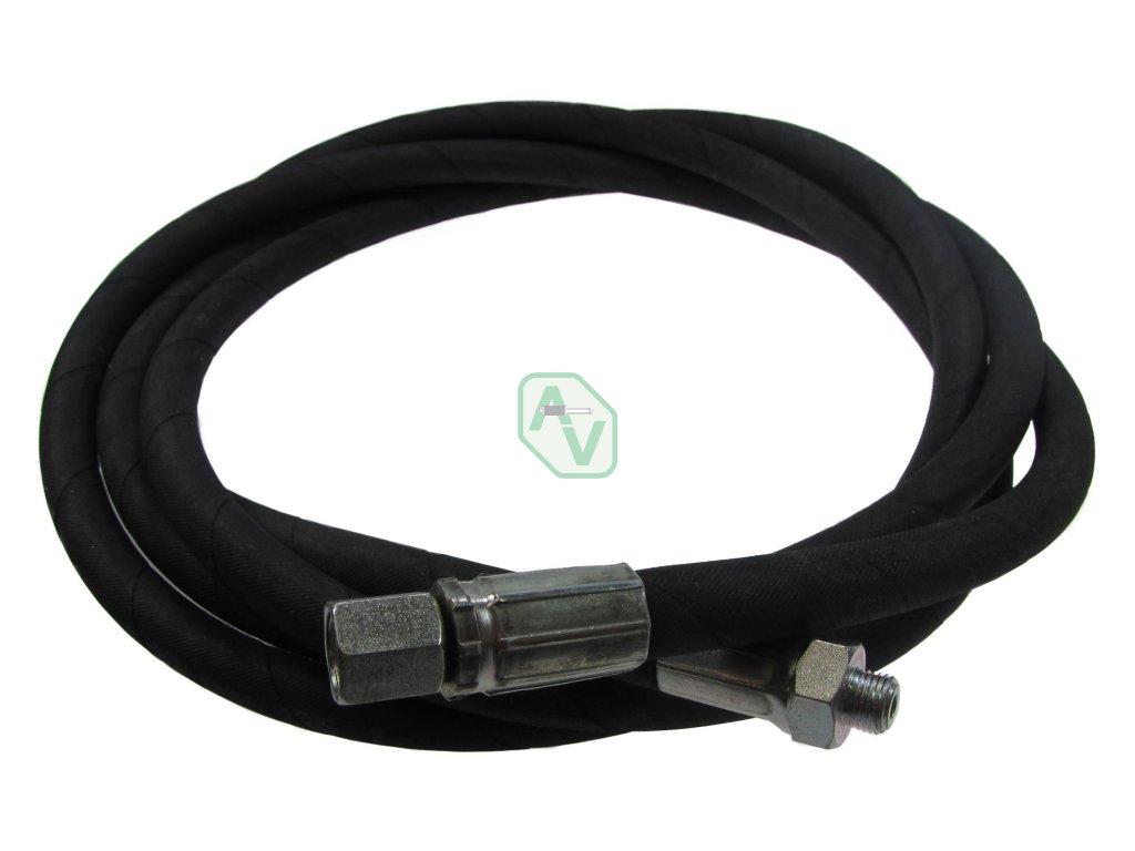 Hochdruckschlauch für Pumpen mit Überwurfmutter. Der Schlauch wird auf der einen Seite mit einem Außengewinde M10x1 und auf der anderen Seite mit einer Überwurfmutter mit Innengewinde M12x1,5 abgeschlossen.Diskussion